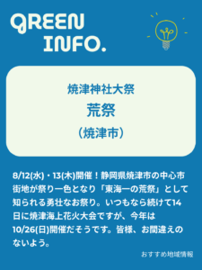 8/12(水)・13(木)開催!静岡県焼津市の中心市街地が祭り一色となり「東海一の荒祭」として知られる勇壮な祭り。いつもなら続けて14日に焼津海上花火大会ですが、今年は10/26(日)開催だそうです。皆様、お間違えのないよう。