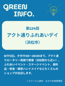 8/17(日)、夕方17:30〜20:00まで。アクト通りロータリー南側での開催なので浜松駅から近いです。ふれあいイベント・ステージイベントがあって、沖縄民謡やポップスが聴けます。食料品、飲食、雑貨ハンドメイドなどたくさんのショップが出店されます。