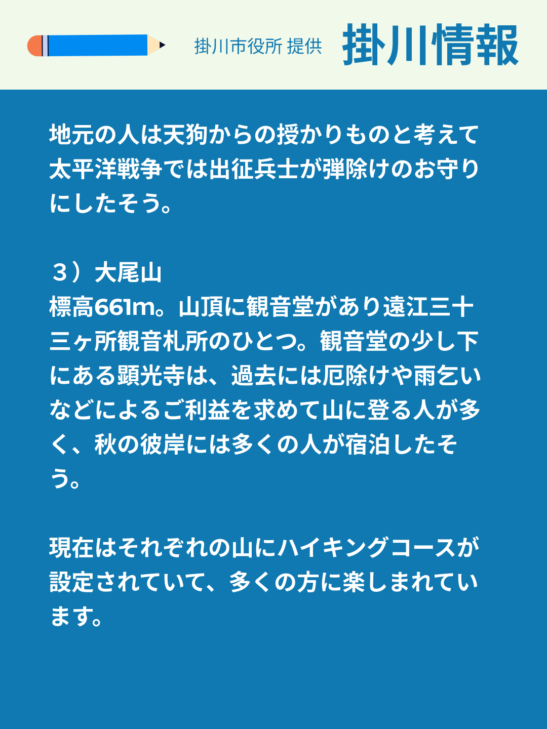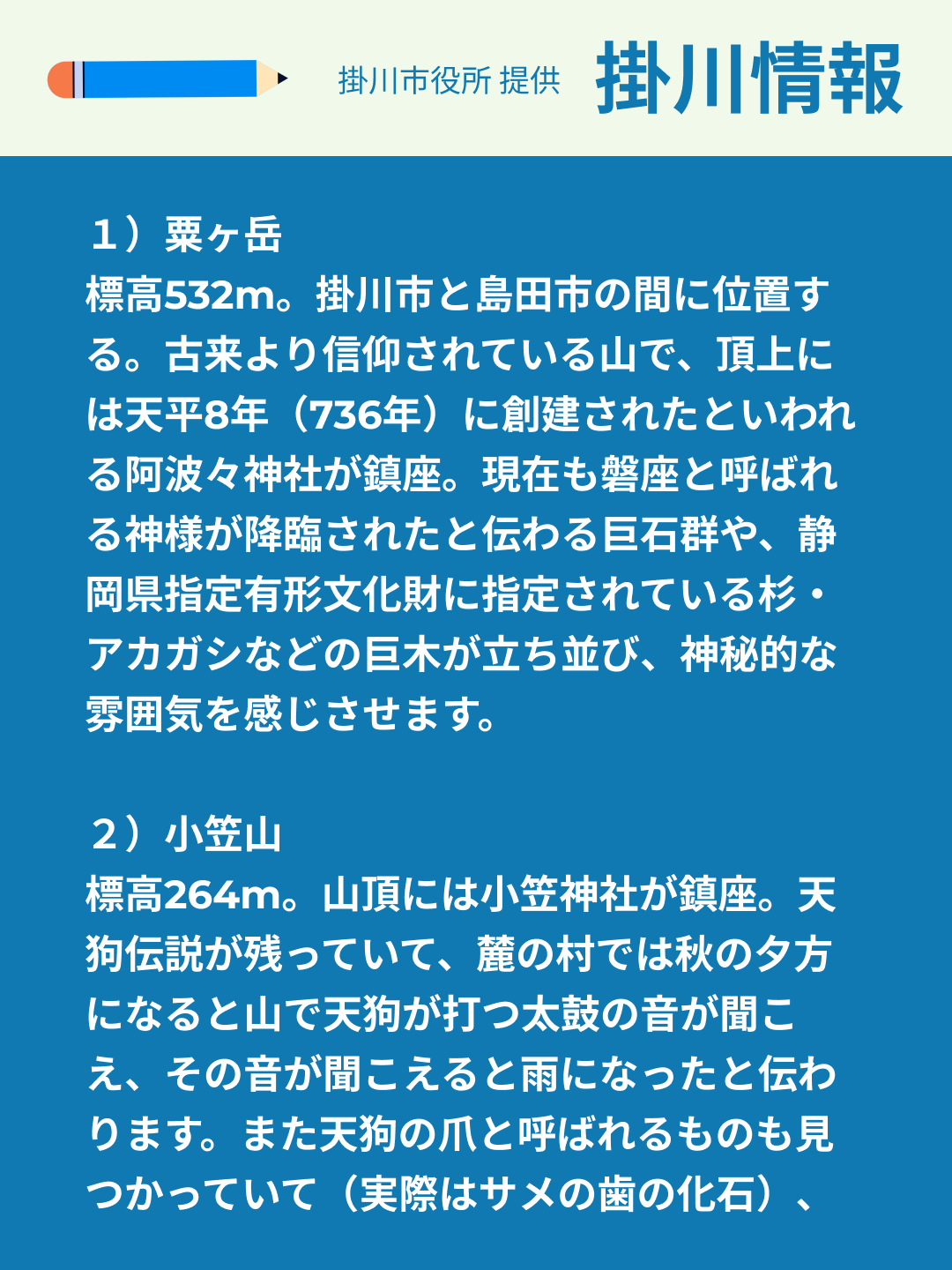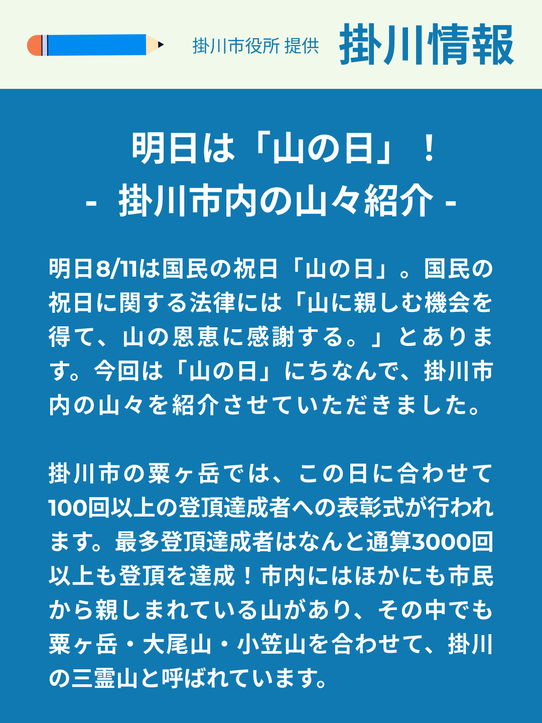 明日8/11は国民の祝日「山の日」。国民の祝日に関する法律には「山に親しむ機会を得て、山の恩恵に感謝する。」とあります。今回は「山の日」にちなんで、掛川市内の山々を紹介させていただきました。