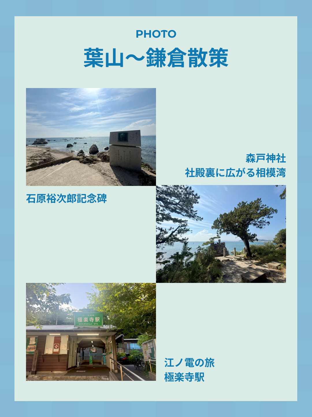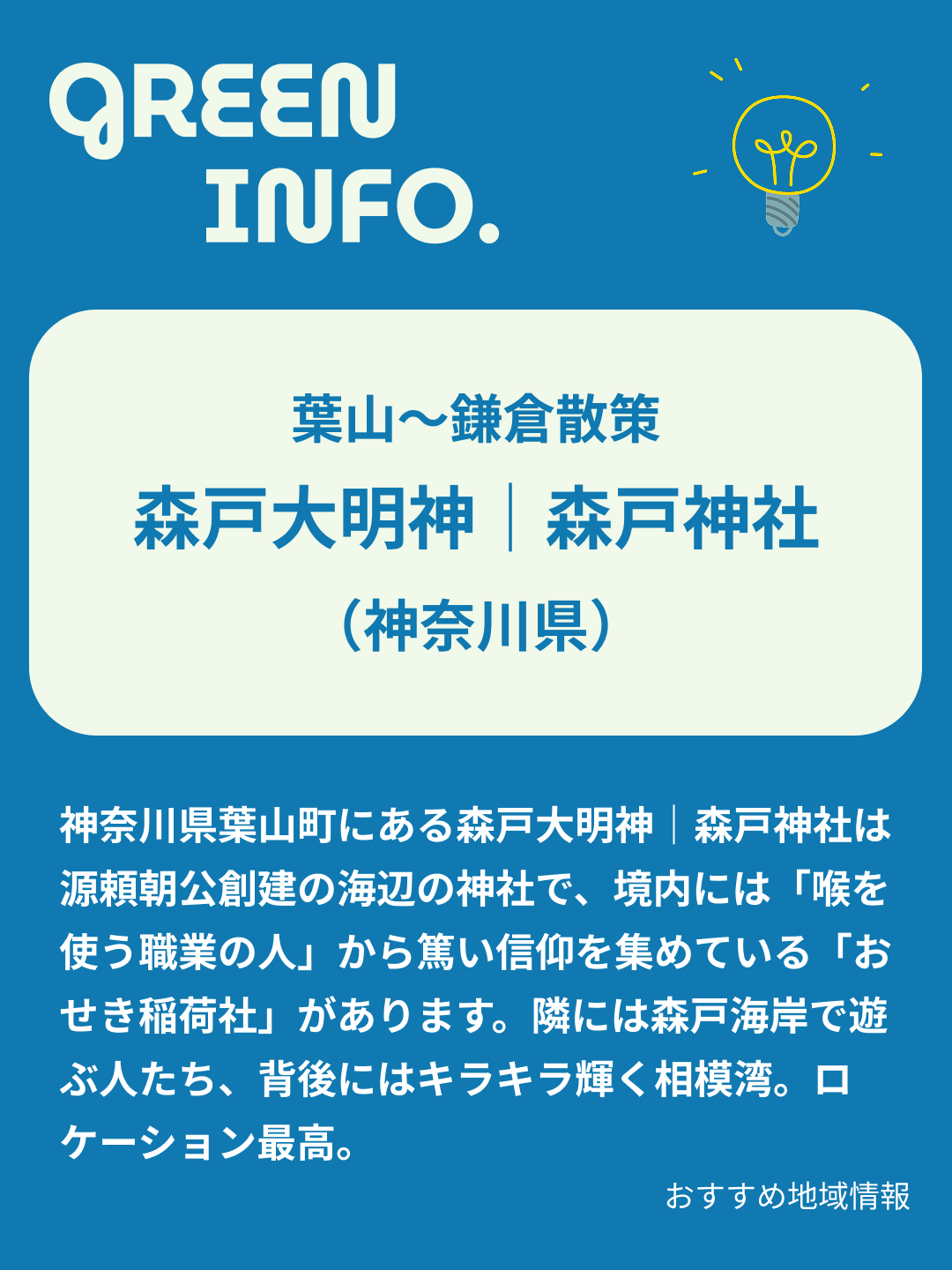 神奈川県葉山町にある森戸大明神|森戸神社は源頼朝公創建の海辺の神社で、境内には「喉を使う職業の人」から篤い信仰を集めている「おせき稲荷社」があります。隣には森戸海岸で遊ぶ人たち、背後にはキラキラ輝く相模湾。ロケーション最高。