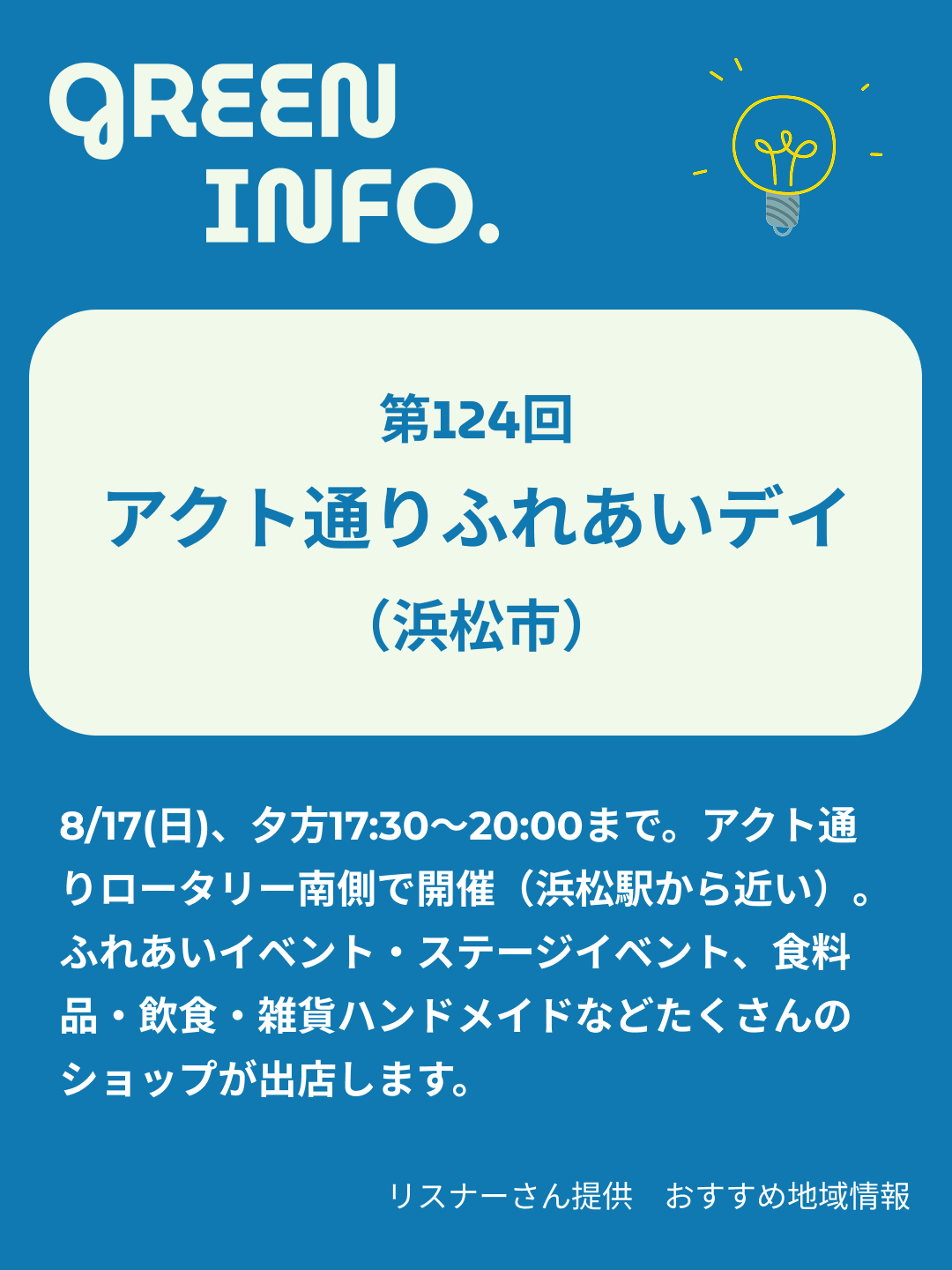 8/17(日)、夕方17:30〜20:00まで。アクト通りロータリー南側での開催なので浜松駅から近いです。ふれあいイベント・ステージイベントがあって、沖縄民謡やポップスが聴けます。食料品、飲食、雑貨ハンドメイドなどたくさんのショップが出店されます。