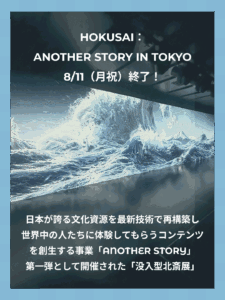 日本が誇る文化資源を最新技術で再構築し 世界中の人たちに体験してもらうコンテンツを創生する事業「ANOTHER STORY」 第一弾として、8/11(月祝)まで6か月に亘り開催されていた没入型北斎展に行ってきました!第二弾もたのしみ!