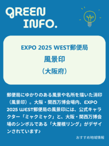郵便局にゆかりのある風景や名所を描いた消印(風景印)。大阪・関西万博会場内、EXPO 2025 WEST郵便局の風景印には、公式キャラクター「ミャクミャク」と、大阪・関西万博会場のシンボルであり世界最大級の木造建築物でもある「大屋根リング」がデザインされています。ちなみに・・・大屋根リングはギネスに認定されたんですよね~。