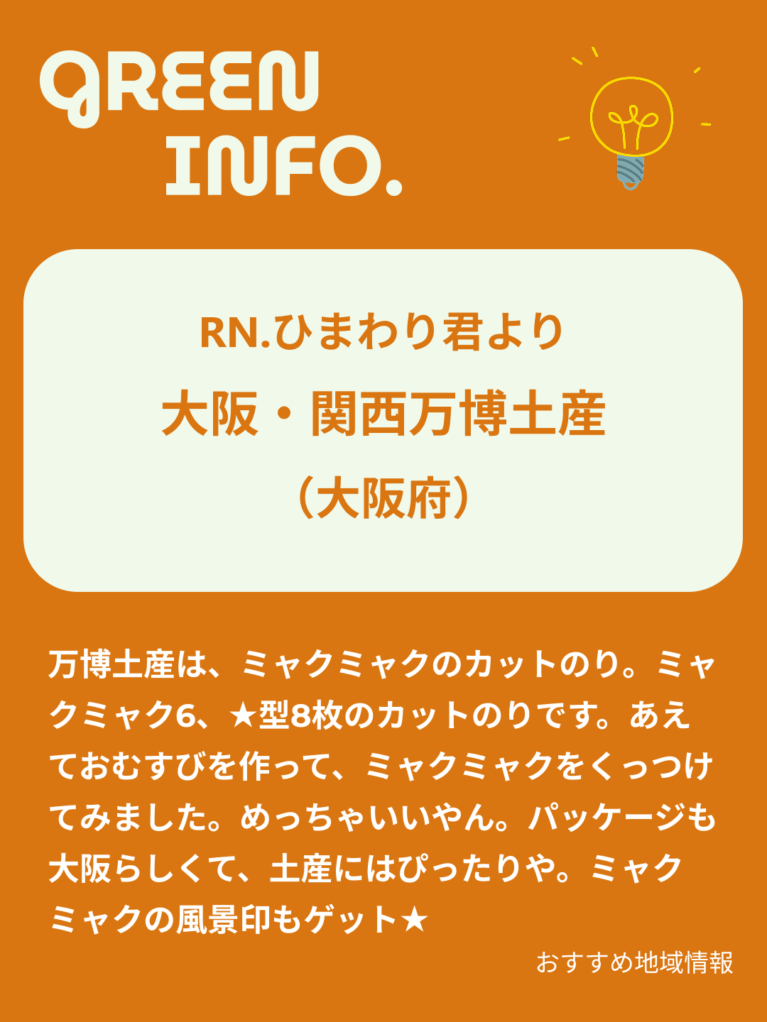 万博土産は、ミャクミャクのカットのり。ミャクミャク6、★型8枚のカットのりです。あえておむすびを作って、ミャクミャクをくっつけてみました。めっちゃいいやん。パッケージも大阪らしくて、土産にはぴったりや。ミャクミャクの風景印もゲットしました。2025年日本国際博覧会(大阪関西万博)の記念切手も土産で購入しました。ミャクミャクがいい味出してるでー。by.ひまわり君
