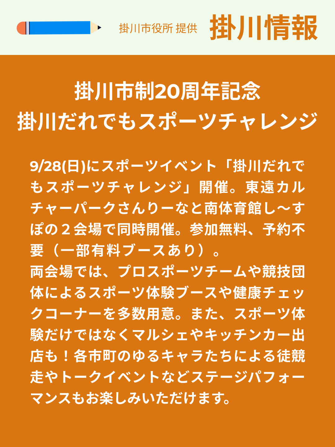 掛川市制20周年を記念し、9/28(日)にスポーツイベント「掛川だれでもスポーツチャレンジ」開催。東遠カルチャーパークさんりーなと南体育館し~すぽの2会場で同時開催。参加無料、予約不要(一部有料ブースあり)。