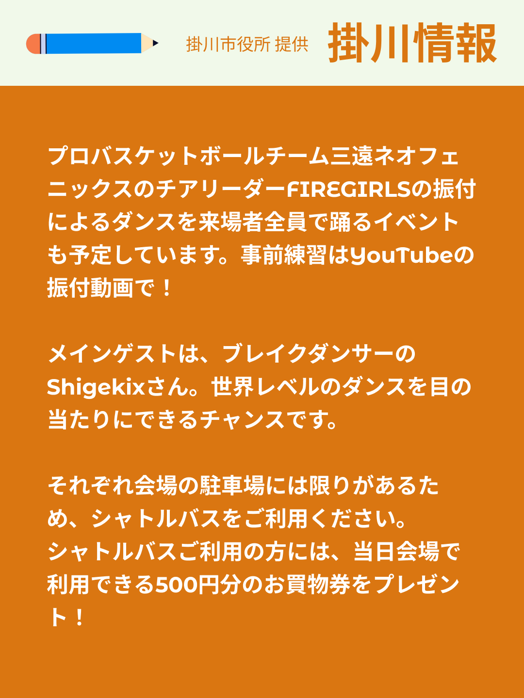 メインイベントとして、プロバスケットボールチーム三遠ネオフェニックスのチアリーダーFIREGIRLSの振付によるダンスを来場者全員で踊るイベントを予定しています。事前練習はYouTubeの振付動画で!