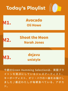今朝のGreen Humming Selectionは、英国ブライトンを拠点にしているジャズアーティスト、キーボーディスト、オリ・ハウの一曲をお届けしました♪最近わたしが毎朝食べている、アボカド。