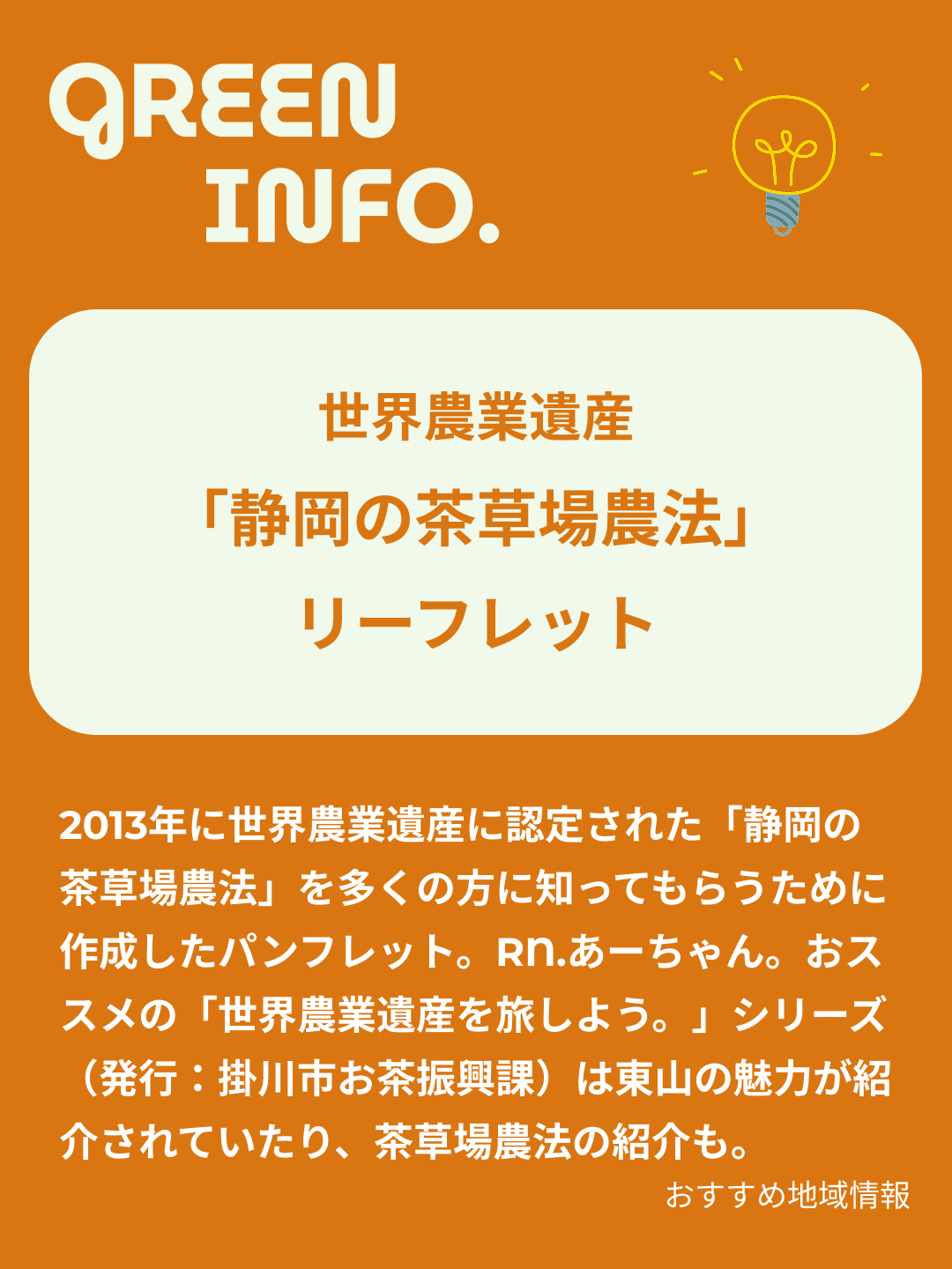 2013年に世界農業遺産に認定された「静岡の茶草場農法」を多くの方に知ってもらうために作成したパンフレット。RN.あーちゃん。おススメの「世界農業遺産を旅しよう。」シリーズ(発行:掛川市お茶振興課)は東山の魅力が紹介されていたり、世界に一つだけのお茶、通常よりひと手間かかる茶草場農法の紹介もあります。粟ヶ岳の魅力も写真とともに紹介されていて、この写真がなんとも癒されますよ♪