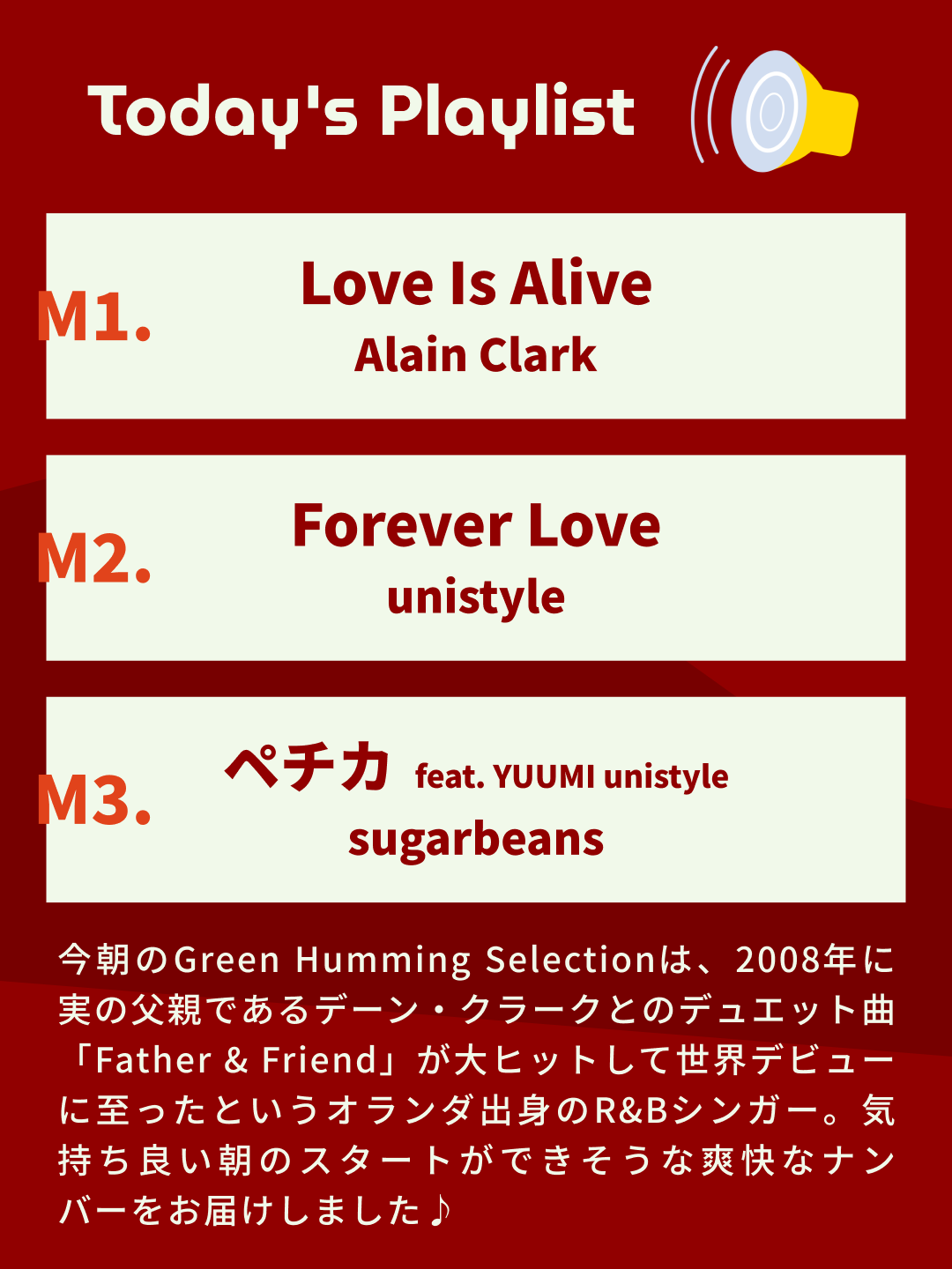 2008年に実の父親であるデーン・クラークとのデュエット曲「Father & Friend」が大ヒットして世界デビューに至ったというオランダ出身のR&Bシンガー、アラン・クラーク。気持ち良い朝のスタートができそうな爽快なナンバーをお届けしました♪
