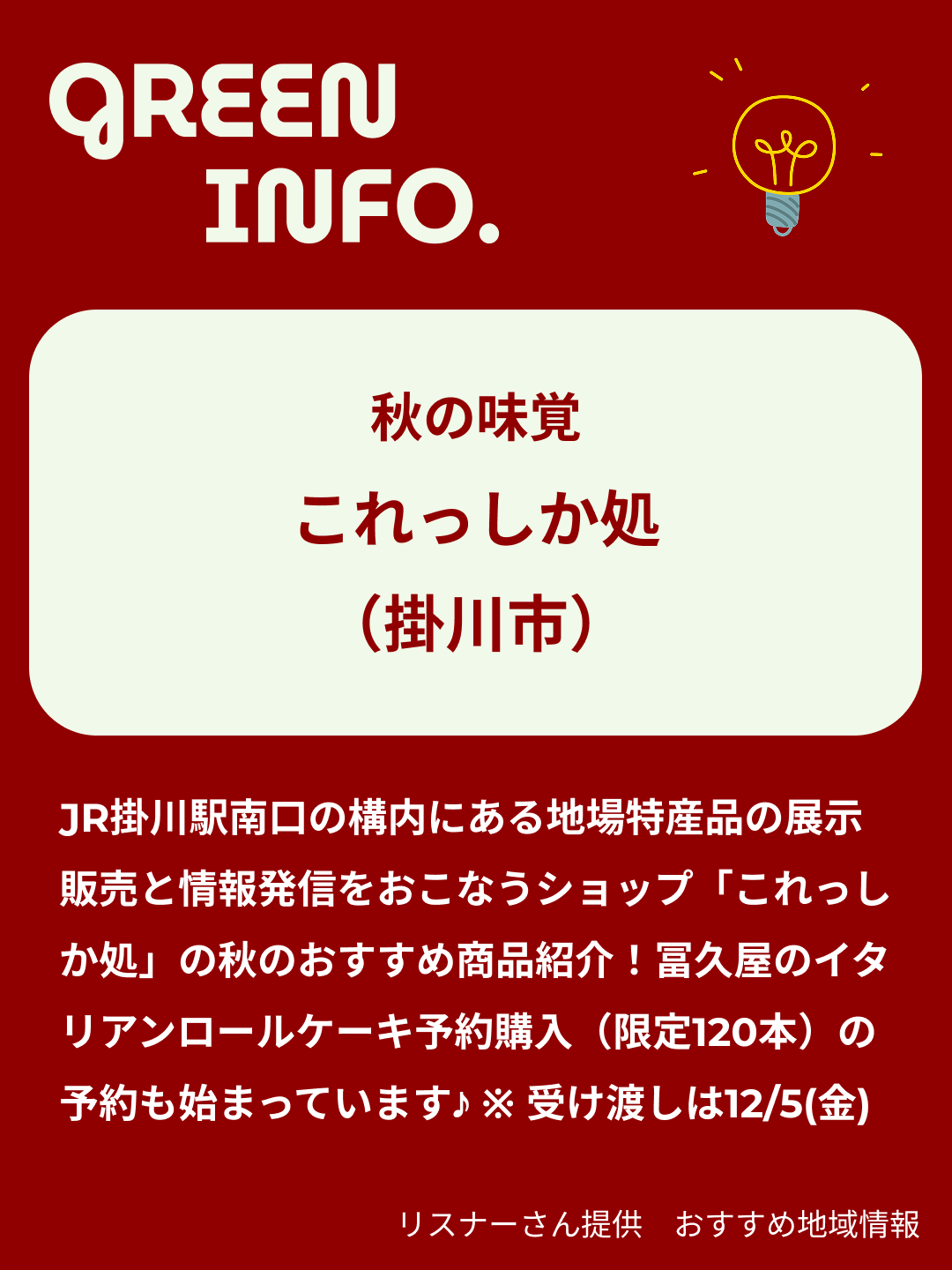 JR掛川駅南口の構内にある地場特産品の展示販売と情報発信をおこなうショップ「これっしか処」の秋のおすすめ商品紹介!うなぎいもチップス・モンブランこっこ・こぼれ和栗モンブラン・栗あんバターベーグル・旨いまぐろシリーズなどなど。冨久屋のイタリアンロールケーキ予約購入(限定120本)の予約も始まっています♪受け渡しは12/5(金)