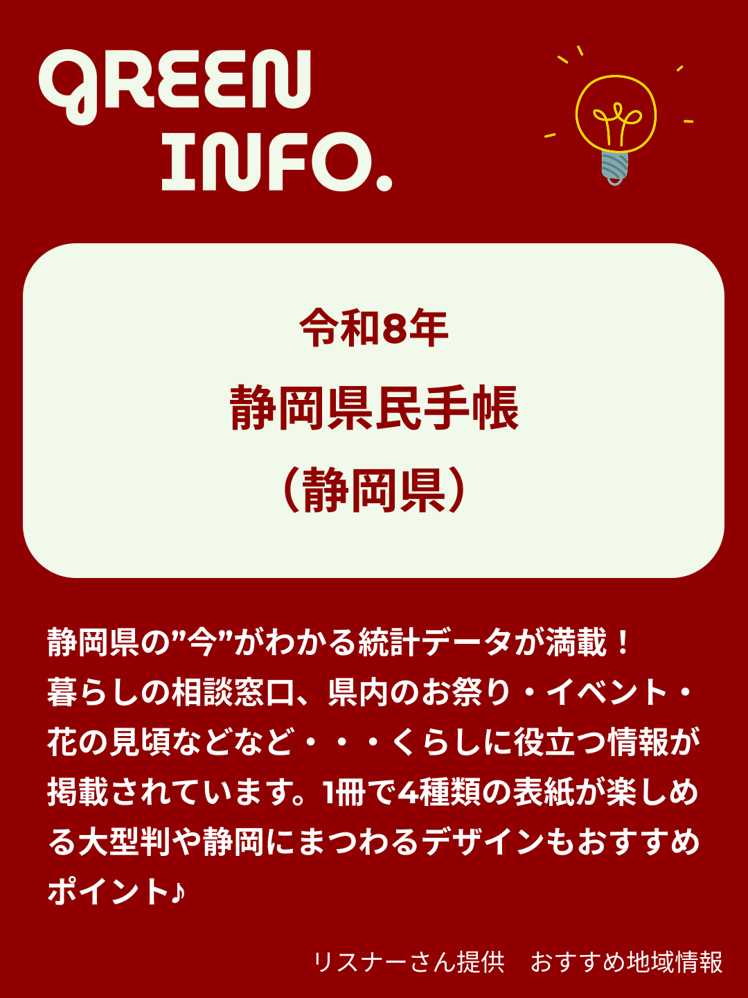 静岡県の”今”がわかる統計データが満載!暮らしの相談窓口、県内のお祭り・イベント・花の見頃など・・・くらしに役立つ情報が掲載されています。1冊で4種類の表紙が楽しめる大型判や静岡にまつわるデザインもおすすめポイント♪