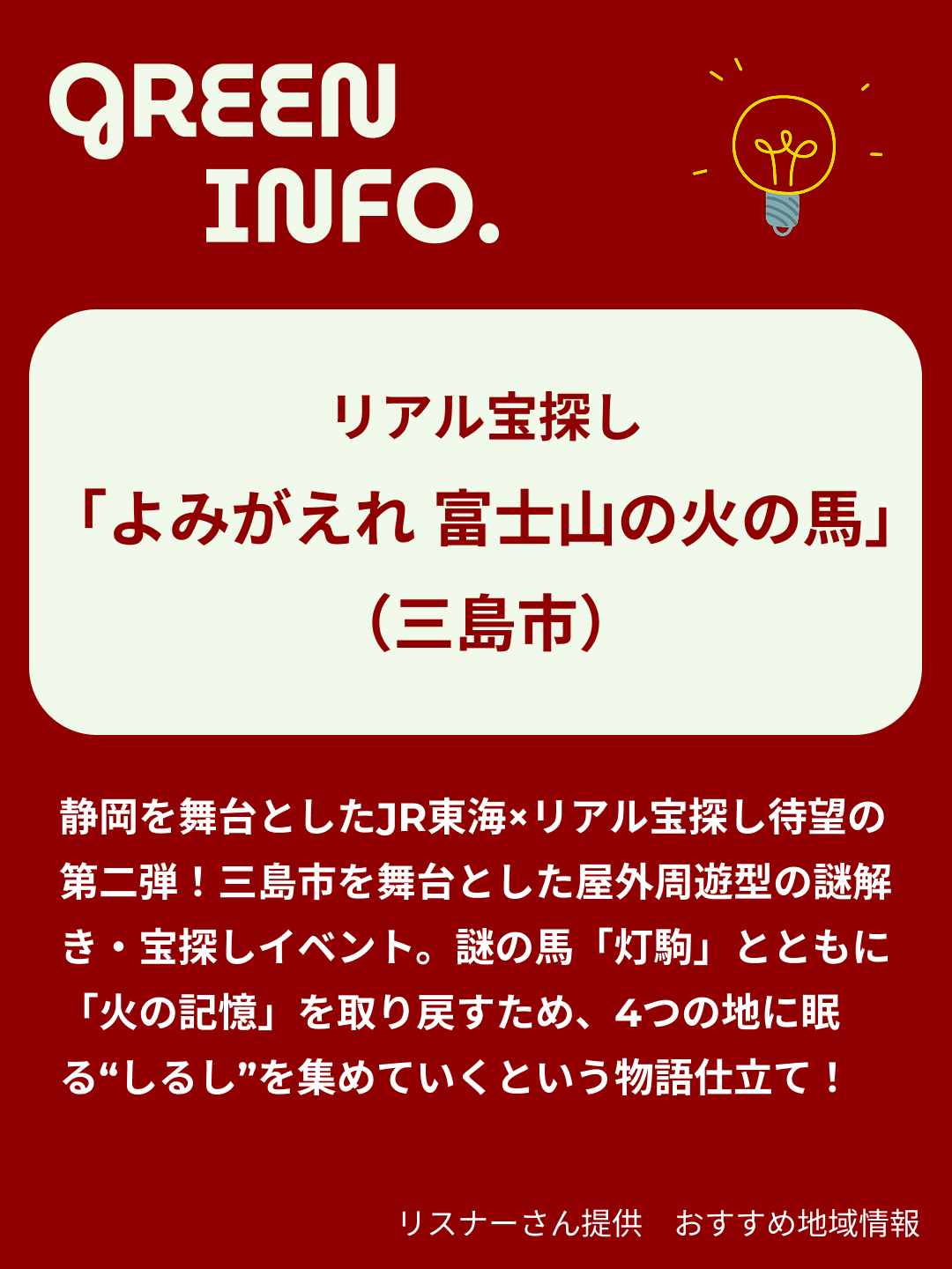 静岡を舞台としたJR東海×リアル宝探し待望の第二弾!三島市を舞台とした屋外周遊型の謎解き・宝探しイベントです。今回のテーマは「灯駒」。謎の馬「灯駒」とともに「火の記憶」を取り戻すため、4つの地に眠る“しるし”を集めていくという物語仕立て!来年3/31(火)まで