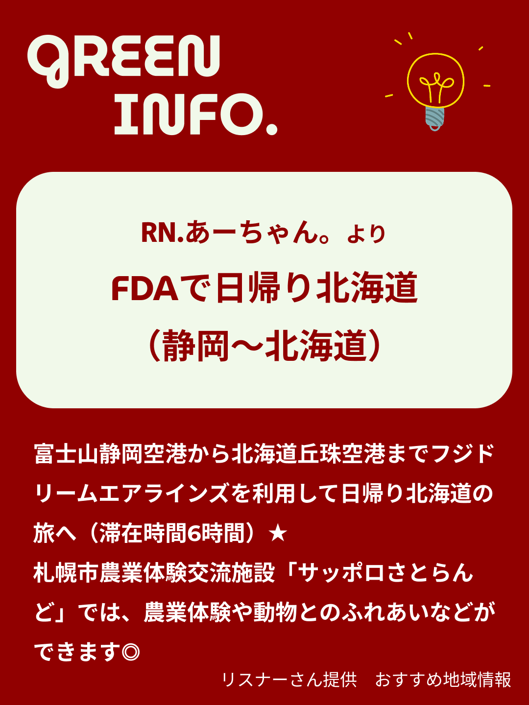 RN.あーちゃん。は、富士山静岡空港から北海道丘珠空港までフジドリームエアラインズを利用して日帰り北海道の旅へ(滞在時間6時間)♪約57haの敷地内(※札幌市農業支援センター、ミルクの郷を除く)にある札幌市農業体験交流施設「サッポロさとらんど」では、農業体験や動物とのふれあいなどができます◎