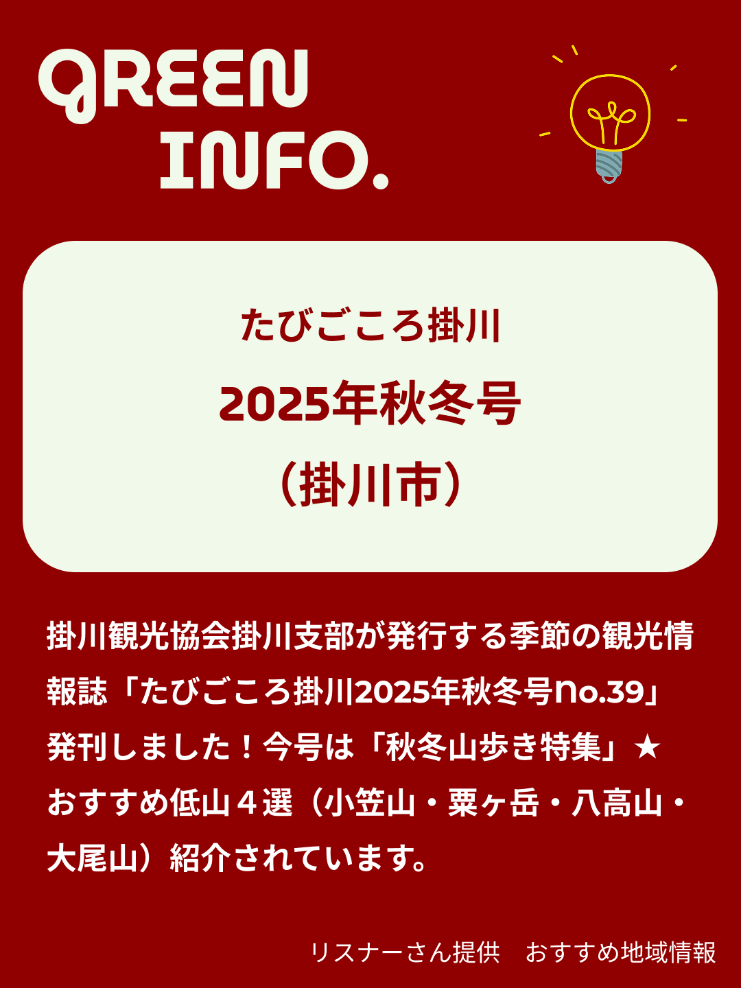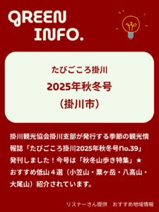 掛川観光協会掛川支部が発行する季節の観光情報誌「たびごころ掛川2025年秋冬号No.39」発刊しました!今号は「秋冬山歩き特集 ~木漏れ日 緑につつまれる ハイキング~」。おすすめ低山4選(小笠山・粟ヶ岳・八高山・大尾山)が紹介されています。今回のプレゼントは「ハイキングマップセット」♪