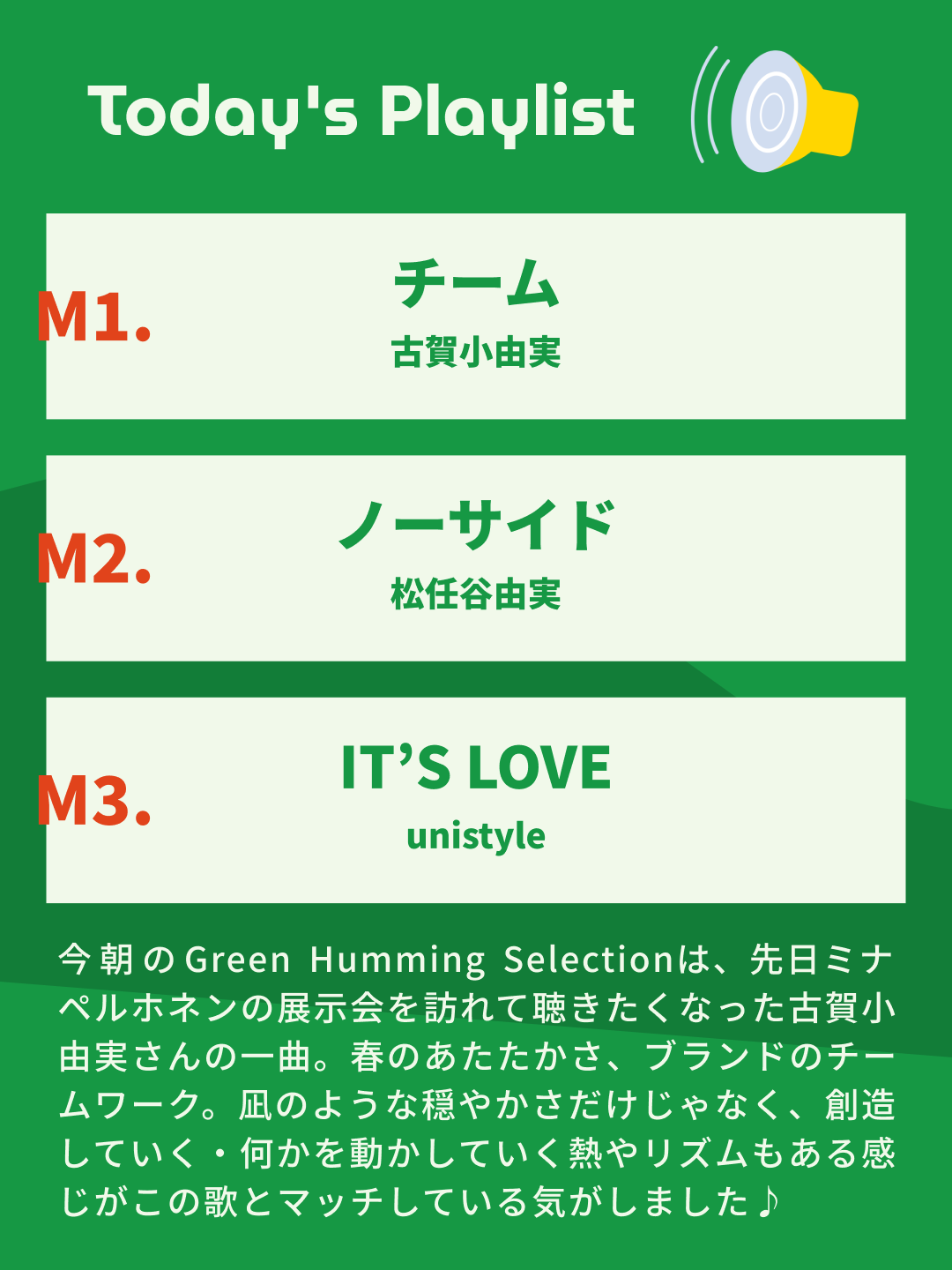 先日、ミナ ペルホネンの展示会を訪れて聴きたくなった歌。春のあたたかさ、ブランドのチームワーク。凪のような穏やかさだけじゃなく、創造していく・何かを動かしていく熱やリズムもある感じがこの歌とマッチしている気がしました♪