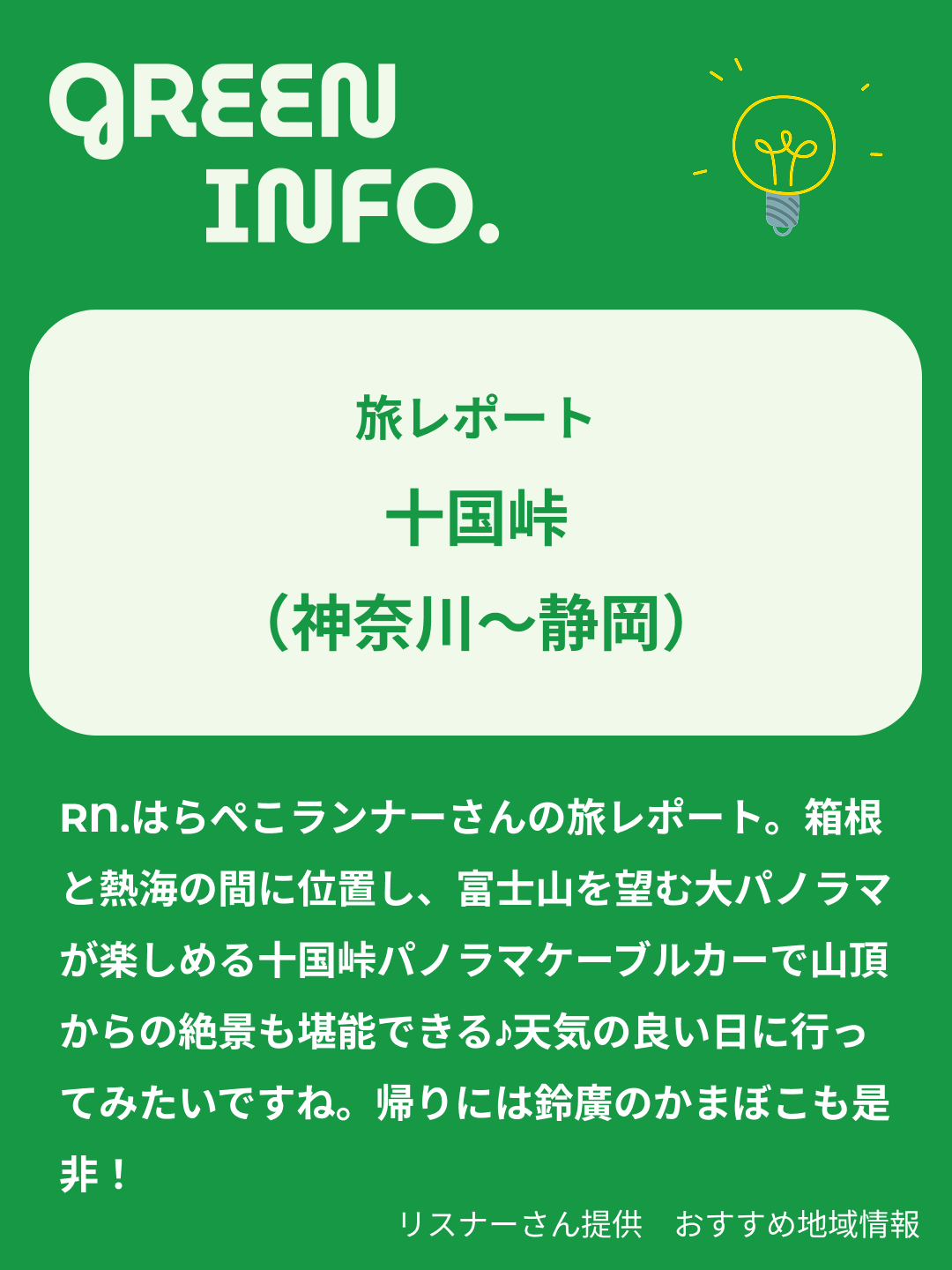 RN.はらぺこランナーさんの旅レポート。箱根と熱海の間に位置し、富士山を望む大パノラマが楽しめる十国峠パノラマケーブルカーで山頂からの絶景も堪能できる♪天気の良い日に行ってみたいですね。帰りには鈴廣のかまぼこも是非!