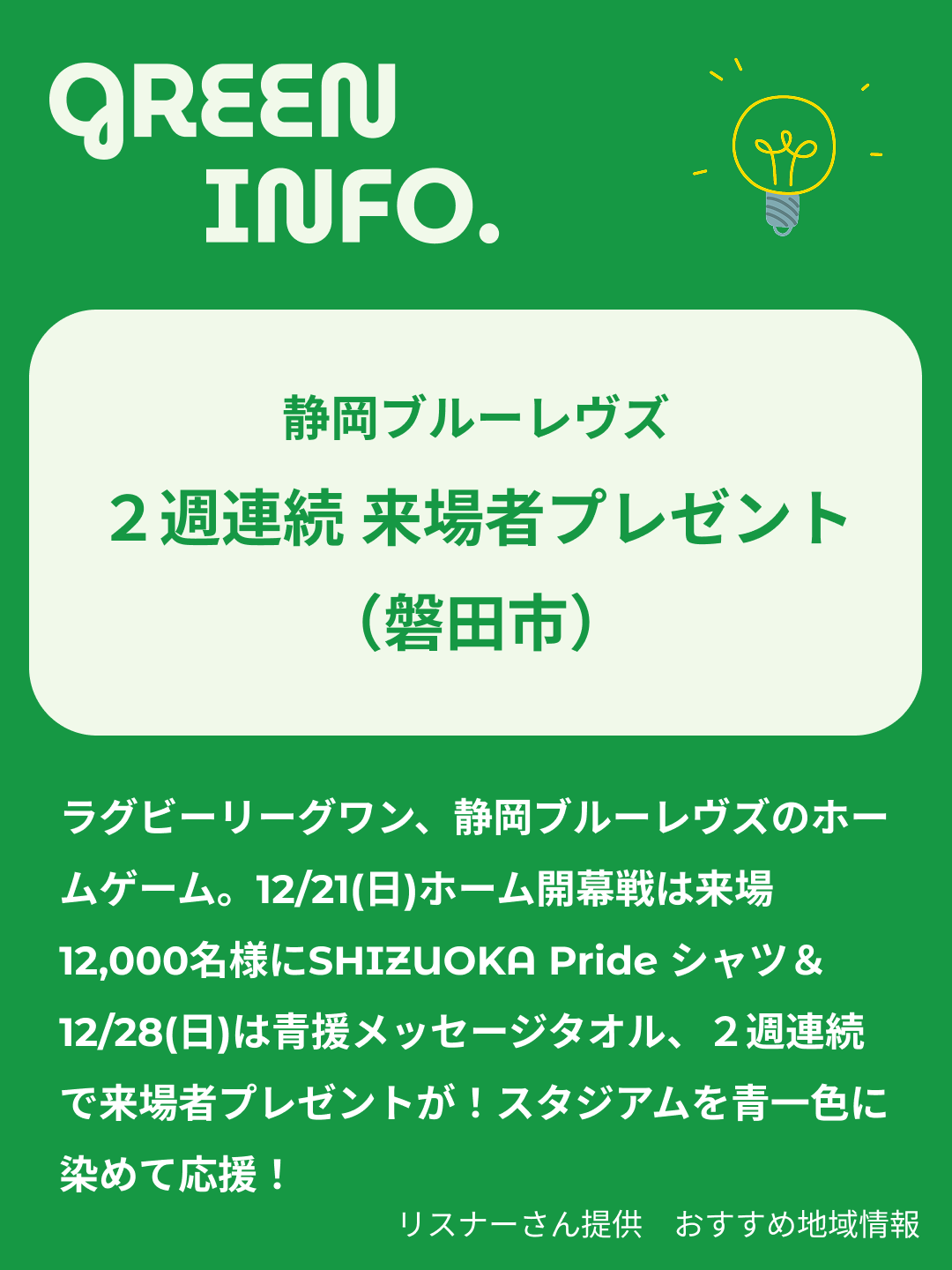 ラグビーリーグワン、静岡ブルーレヴズのホームゲーム。12/21(日)ホーム開幕戦は来場12,000名様にSHIZUOKA Pride シャツ&12/28(日)は青援メッセージタオル、2週連続で来場者プレゼントが♪