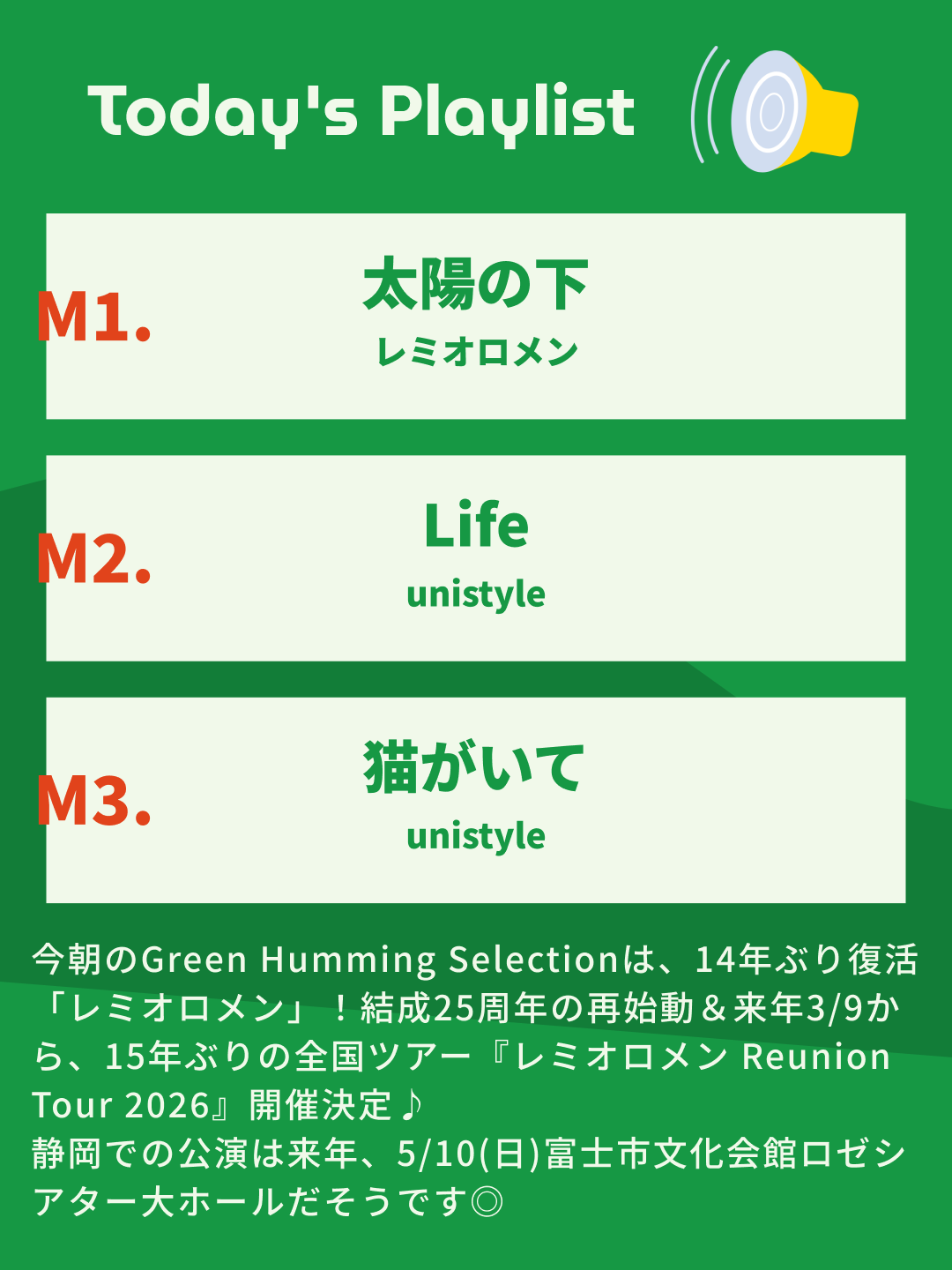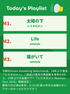 藤巻亮太(ボーカル・ギター)前田啓介(ベース)神宮司治(ドラム)による3ピースロックバンド「レミオロメン」14年ぶり復活!結成25周年の再始動&来年3/9から15年ぶりの全国ツアー『レミオロメン Reunion Tour 2026』開催決定♪5/10(日)には富士市文化会館ロゼシアター公演!神宮司治さんのHappySessionの思い出etc…