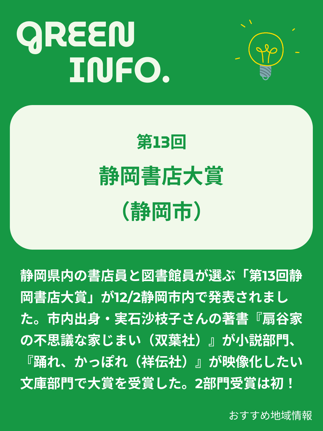 静岡県内の書店員と図書館員が選ぶ「第13回静岡書店大賞」が12/2静岡市内で発表されました。市内出身・実石沙枝子さんの著書『扇谷家の不思議な家じまい(双葉社)』が小説部門、『踊れ、かっぽれ(祥伝社)』が映像化したい文庫部門で大賞を受賞した。2部門受賞は初!