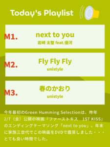 今年最初のGreen Humming Selectionは、昨年2/7(金)公開の映画『ファーストキス 1ST KISS』のエンディングテーマソング「next to you」。年末に家族三世代でこの映画をDVDで鑑賞しました。エンドロールで流れるこの歌が肌に沁み込む感じで・・・とても良い時間でした。