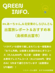 RN.あーちゃん。とRN.北安東のしらぴんさんより、出雲旅のお話&おすすめ本をご紹介いただきました♪”バタデン”の愛称で親しまれている一畑電車の「おでん列車」は食事とお酒付のおにぎりコース(大人6,000円/松江便・出雲便・貸切)とお寿司プレミアムコース(大人7,500円/貸切のみ)1/31まで運行されています(出雲便は1/17最終)!