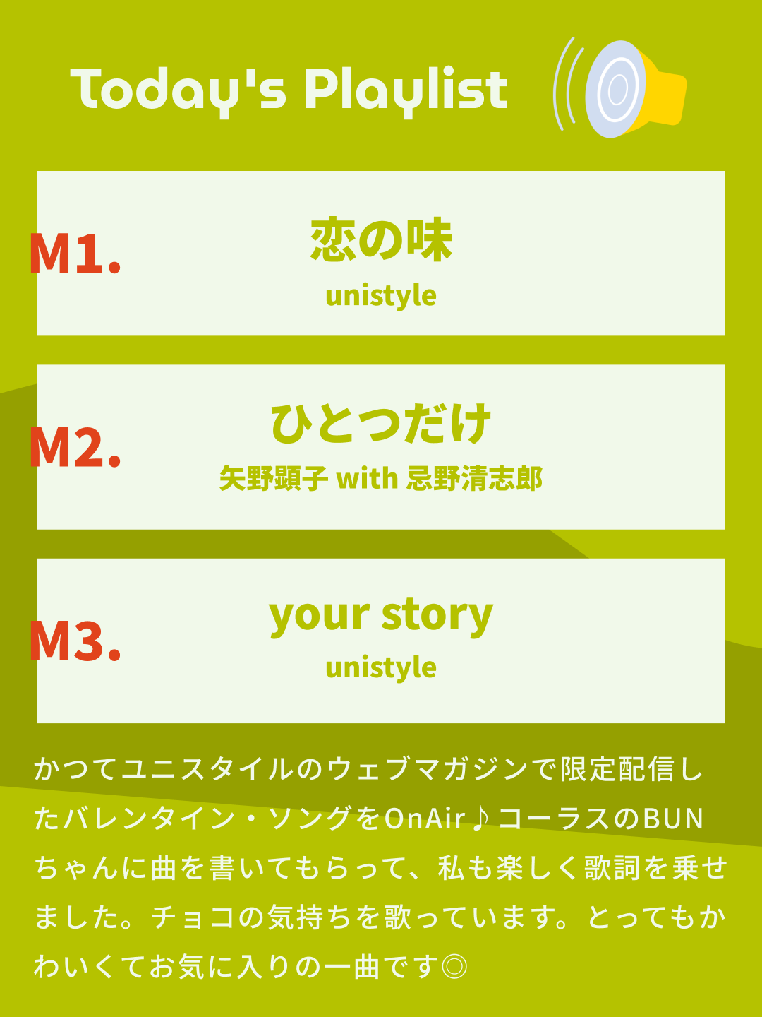 かつてユニスタイルのウェブマガジンで限定配信したバレンタイン・ソングをOnAir♪コーラスのBUNちゃんに曲を書いてもらって、私も楽しく歌詞を乗せました。チョコの気持ちを歌っています。とってもかわいくてお気に入りの一曲です◎