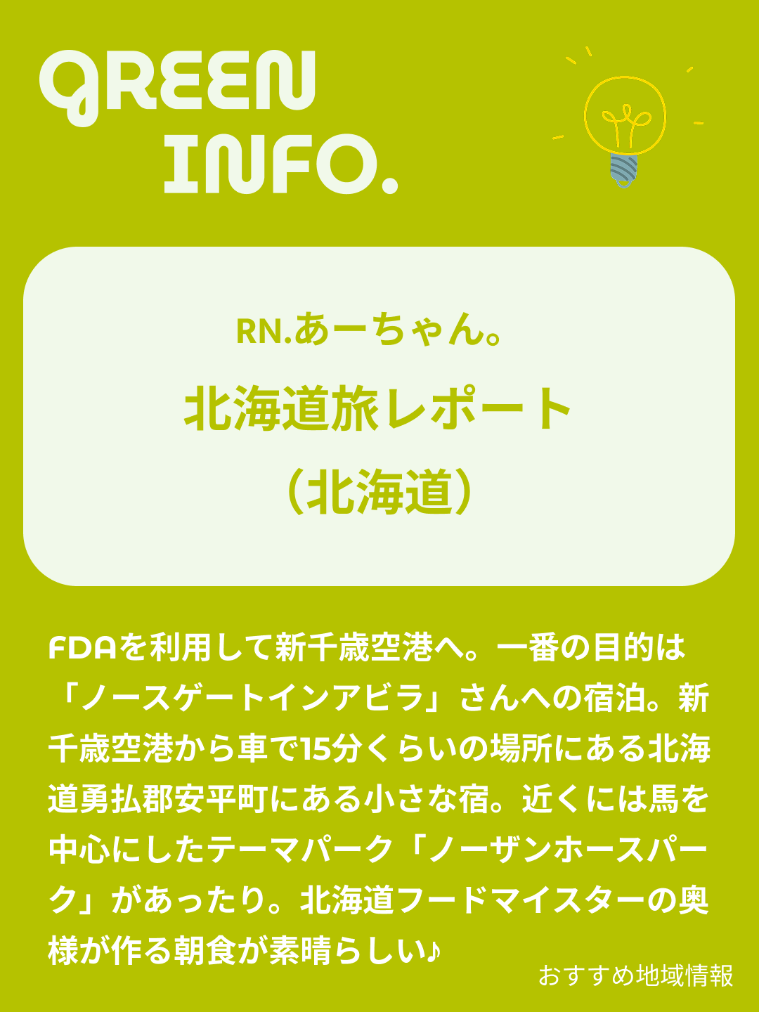 FDAを利用して富士山静岡空港から新千歳空港まで行ってきた、あーちゃん。一番の目的は「ノースゲートインアビラ」さんへの宿泊。新千歳空港から車で15分くらいの場所にある北海道勇払郡安平町にある小さな宿です。オーナーのご主人は馬が大好きで、宿にも馬に関連する本や飾りがさり気なくオシャレに飾られているそう。宿の近くには馬を中心にしたテーマパーク「ノーザンホースパーク」があったり。北海道フードマイスターの奥様が手作りされる朝食が本当に素晴らしく地元の野菜をたっぷり使ったやさしい朝食がいただけます。