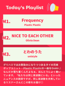 グリハミではお馴染みになりつつあるタイの兄妹ポップユニット・Plastic Plasticの一曲をOnAir♪なんだか落ち着くんだよなぁ。ほんとうによく聴いているユニットです。「私たちは同じ周波数・同じ波長」といったニュアンスの歌詞ですが、同じ周波数を共有しているリスナーさんにこの歌をお届けします◎