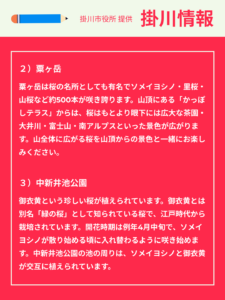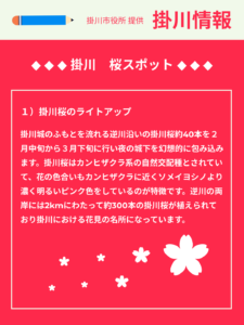 掛川城のふもとを流れる逆川沿いの掛川桜約40本を2月中旬から3月下旬に行い夜の城下を幻想的に包み込みます。掛川桜はカンヒザクラ系の自然交配種とされていて、花の色合いもカンヒザクラに近くソメイヨシノより濃く明るいピンク色をしているのが特徴です。逆川の両岸には2kmにわたって約300本の掛川桜が植えられており掛川における花見の名所になっています。