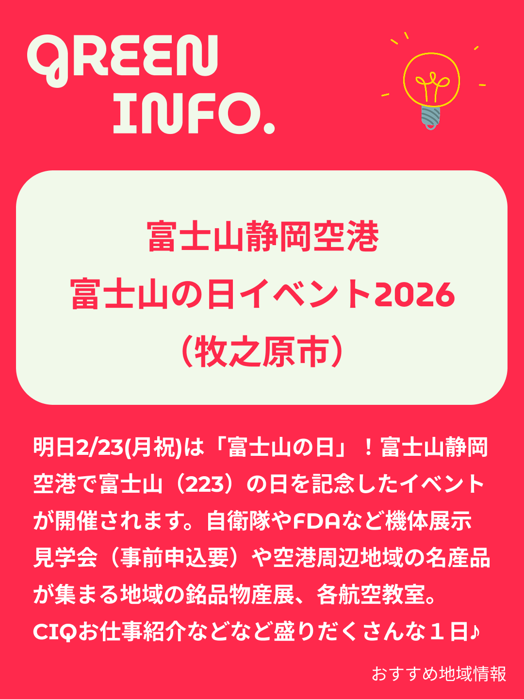 明日2/23(月祝)は「富士山の日」!富士山静岡空港で富士山(223)の日を記念したイベントが開催されます。自衛隊やFDAなど機体展示見学会(事前申込要)や空港周辺地域の名産品が集まる地域の銘品物産展、各航空教室。CIQお仕事紹介など・・・楽しそうな内容が盛りだくさんの1日◎