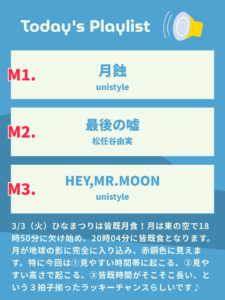 3/3(火)ひなまつりは皆既月食!月は東の空で18時50分に欠け始め、20時04分に皆既食となります。月が地球の影に完全に入り込み、赤銅色に見えます。特に今回は①見やすい時間帯に起こる、②見やすい高さで起こる、③皆既時間がそこそこ長い、という3拍子揃ったラッキーチャンスらしいです♪