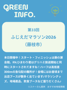 本日開催中!スタート・フィニッシュは藤の瀬会館。RN.ひまわり君はグリハミ放送開始と同時にスタートされてますね!ハーフは高低差300mの急勾配の難所があるそう・・・!会場にはお昼頃まで出店ブースが数多く出ています♪マラソングッズ等の販売店や、地場産品の販売、飲食等のブースなどなど盛りだくさん♪