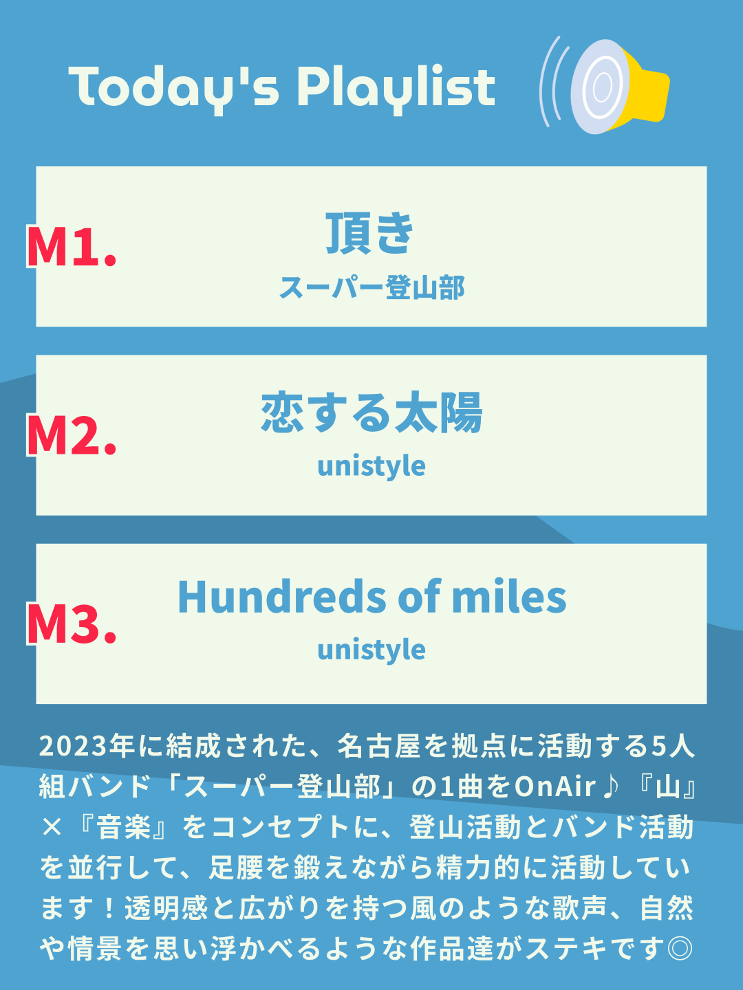 2023年に結成された、名古屋を拠点に活動する5人組バンド。『山』×『音楽』をコンセプトに、登山活動とバンド活動を並行して、足腰を鍛えながら精力的に活動しています!透明感と広がりを持つ風のような歌声、自然や情景を感じられる作品達がとてもスキです♪