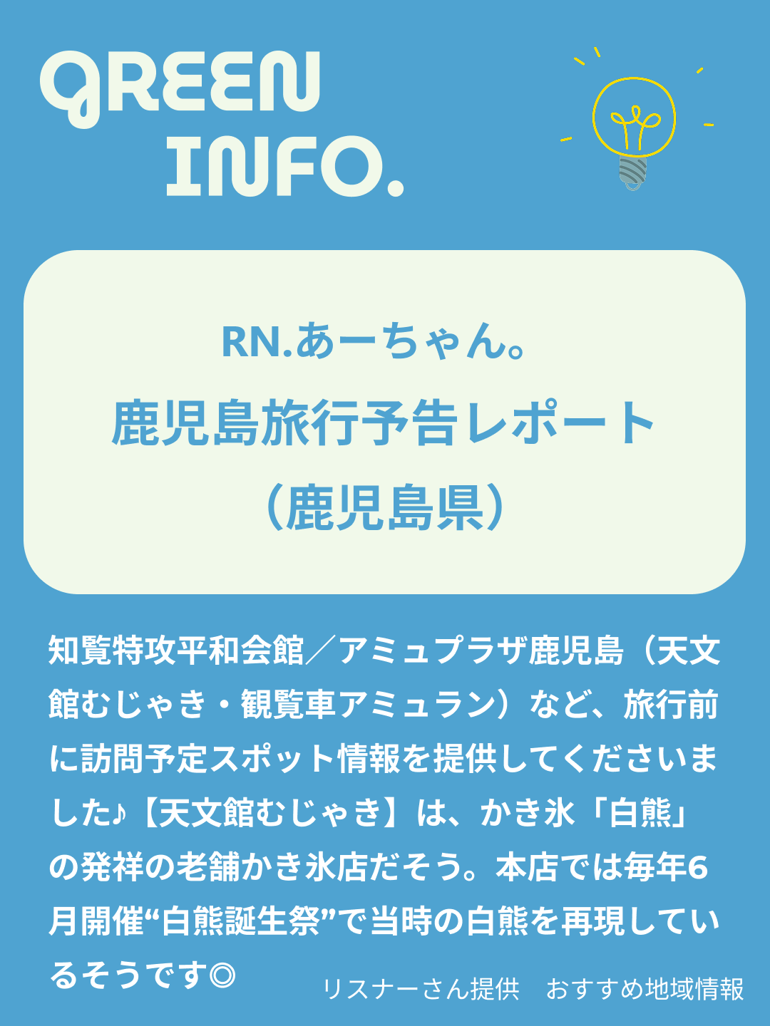 RN.あーちゃん。本日鹿児島旅行2日目真っ只中!知覧特攻平和会館/アミュプラザ鹿児島(天文館むじゃき・観覧車アミュラン)など、旅行前に訪問予定スポット情報を提供してくださいました♪【天文館むじゃき】は、かき氷「白熊」の発祥の老舗かき氷店だそう。天文館むじゃき本店では毎年6月開催“白熊誕生祭”で当時の白熊を再現しているそうです◎